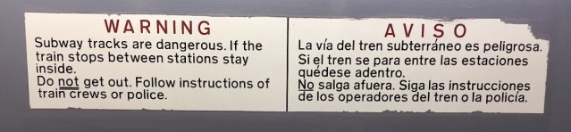 Most days there were unexplained delays and the 20-minute ride to Church Street took much longer than that. The unvoiced question dangled in the stifling air: how long will we be stuck this time? People would hang their heads in defeat and heave a sigh of resignation knowing they were at the mercy of the subway puppeteers. I stared at this sign for so many mindless hours I can still recite the entire message in both English and Spanish: