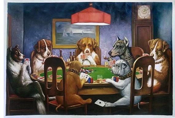 It was no secret that the Boxers were in debt big time to loanshark Weezy “Pit Bull” Mulally, and had cooked up a scheme to win back their losses that night. The game was going strong and the pot was getting bigger when one of the Boxers slipped the other a card under the table. Things were looking good for them and they surreptitiously exchanged a few more cards without anyone noticing. The hounds were growling their displeasure as the Boxers won game after game.