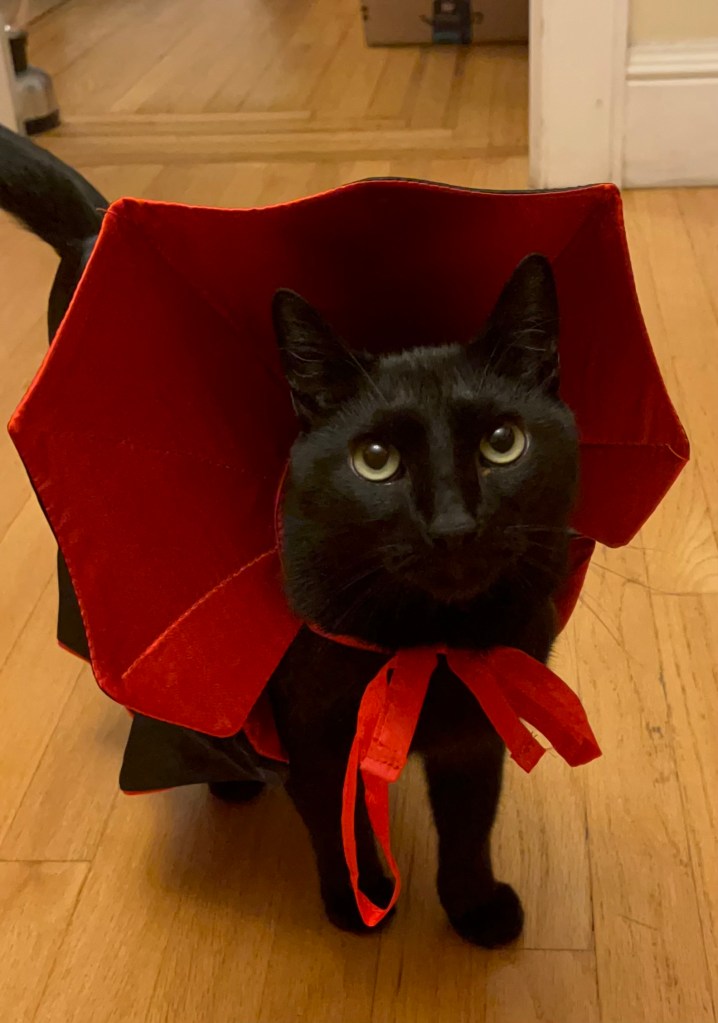 Happy Halloween! Sharing a pic of Galaxy, our granddaughter’s cat, in his vampire cat costume. Those eyes really get the blood pumping! Yes, he’s all black and perfectly gorgeous!