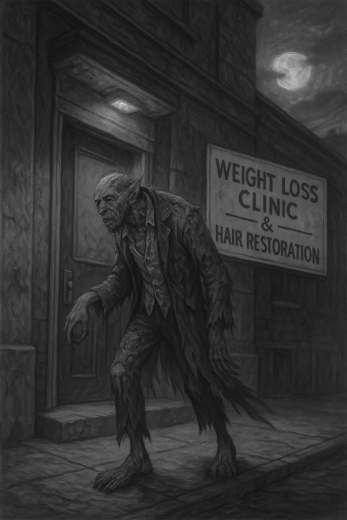 Joshua stumbled into the Back Alley Weight Loss & Hair Restoration Clinic. His once-charming demeanor was now twisted into something sinister and grotesque. The receptionist gasped as he approached, his gaunt face covered in patches of coarse hair.