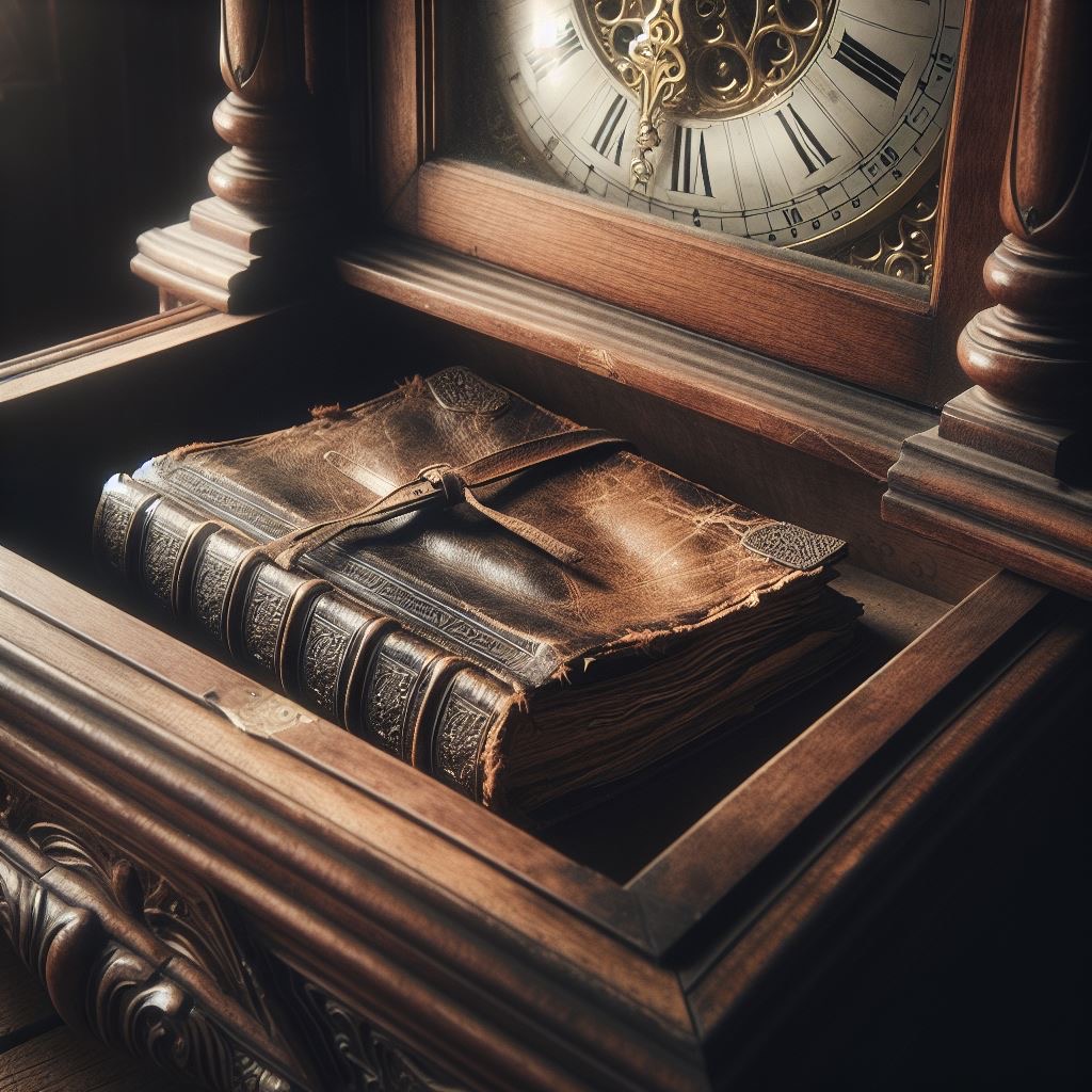 The old house creaked as I climbed the worn stairs, my footsteps echoing through empty halls. For years, I’d avoided this place, rooted in childhood fear. But the clock was ticking …. I had an hour before the auction. I stirred dust with each step, memories rising like ghosts. Before Gran died, she’d whispered about something hidden, her voice a fading echo. “Look where time slips”, she’d said. In her bedroom, the grandfather clock stood silent. I ran my fingers along its base and felt it …. a loop of metal, a hidden latch. One tug and the panel swung open! Inside lay a weathered leather journal, its pages yellow with age. The first entry stopped my breath: “To whoever finds this, I’m sorry for what I’ve done.”