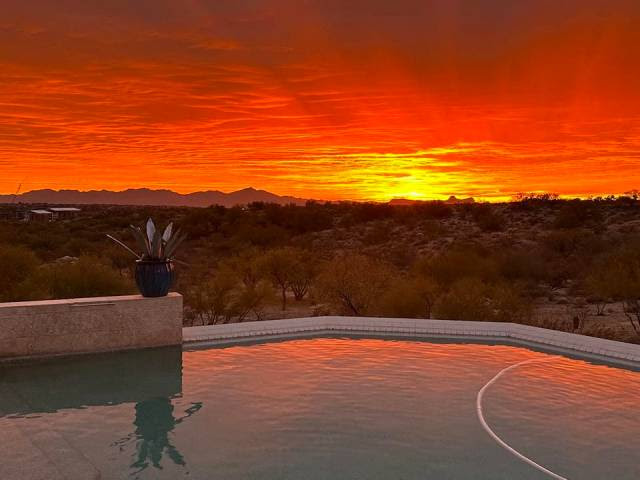 She floated in the pool, mesmerized by the crimson sky bleeding across the horizon. She sipped her merlot, feeling her body relax. What a perfect evening. The water reflected fire-orange light as she closed her eyes, peaceful.