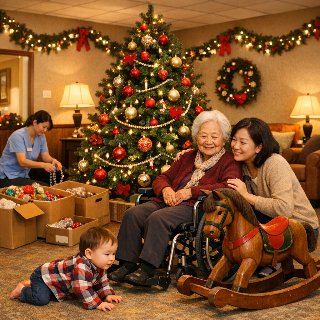Mrs. Chen chuckled as Alex, her great-grandson, tried to swipe at a teddy bear ornament hanging from a low branch. She watched approvingly as his mother redirected him away from the tree toward a rocking horse. It had been delivered that morning along with several boxes of gifts for the residents. Alex climbed aboard with joyful determination, making it teeter dramatically. The horse creaked and swayed, and suddenly Alex pointed upward, laughing.