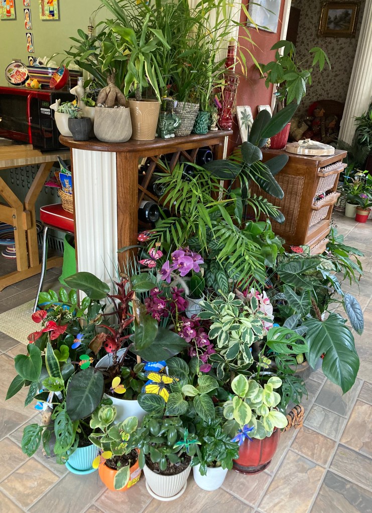 The plant gods blessed me with a green thumb; however, I cannot for the life of me grow orchids. If you want an orchid dead, give it to me. The image you see above is of some of my house plants; the photo was taken this morning. All the plants are real and thriving …. except for the orchids. Any orchid plants you see in the image are artificial; that’s the only way I can have orchids that last more than two weeks.