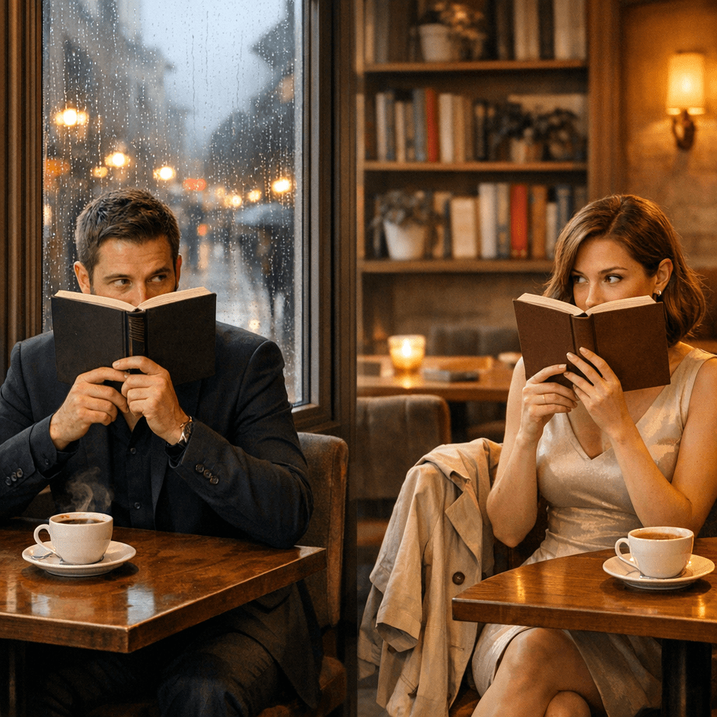 She chooses a table diagonal to his, close enough. While stirring her coffee, she looks toward the window, but her eyes drift sideways. Their gazes collide. She smiles, barely, then looks away, tucking hair behind her ear.
