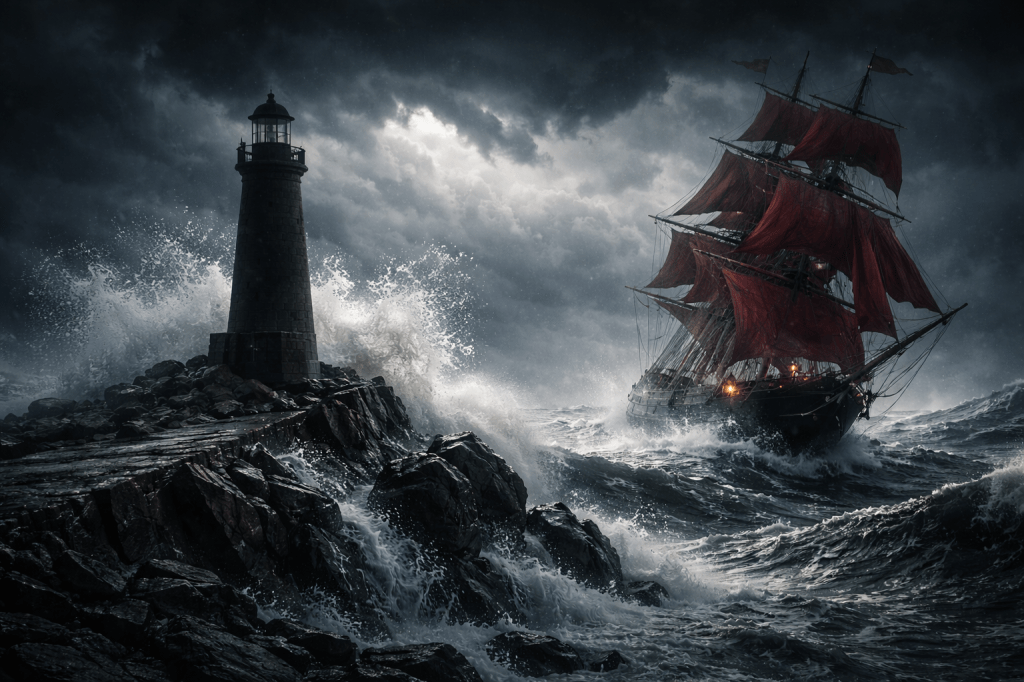 On the night of the storm, the red sails appeared early. Cassandra flew down the stairs, her heart racing, neglecting to light the beacon. She stood on the beach, salt spray stinging her face, calling his name into the wind.