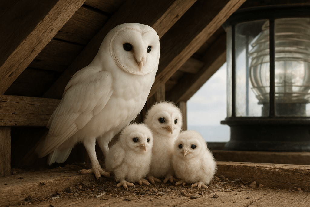 At the top, he found her …. a barn owl, pure white, nesting in the corner. Beside her, three chicks no bigger than his fist, their downy feathers soft as the creamy foam of baby shampoo, their innocence so complete it stopped his breath.