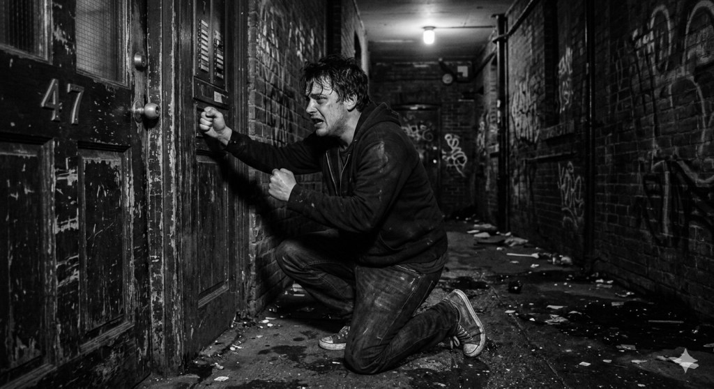His legs gave out. He slid down the door until his knees hit the filthy concrete, hands pressed together like prayer meant something to him anymore.