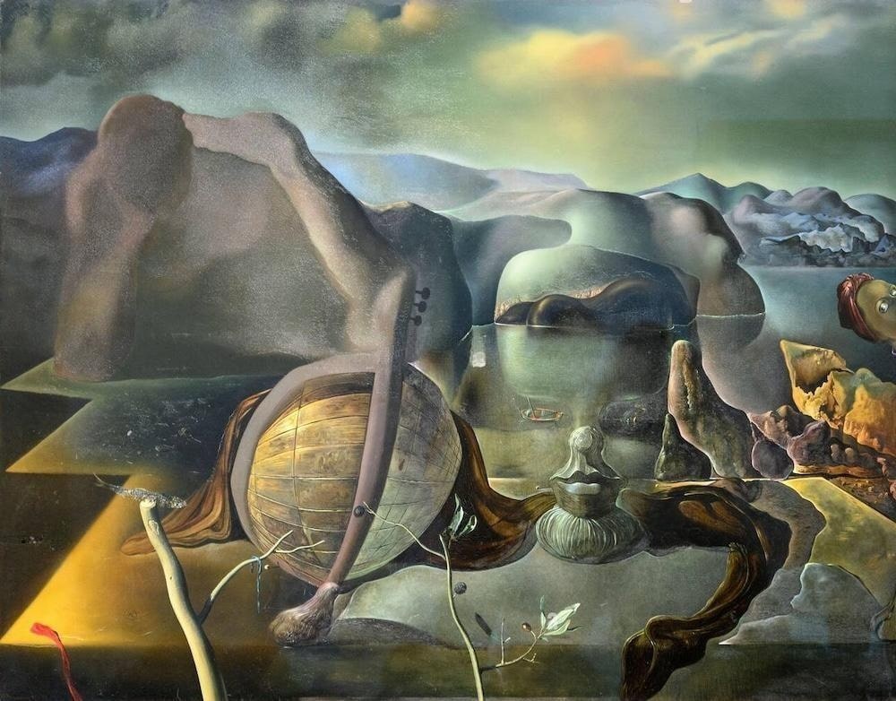 As its title suggests, this work, composed of no less than six different subjects, is by far the most complex and enigmatic of the multiple-image paintings that Salvador Dali made in 1938. The artist painted The Endless Enigma while vacationing at the La Pausa estate of the couturier Coco Chanel, which was located at Roquebrune on the Cote d’Azur. This summer home provided the necessary space and quietude for Dali to continue his research into paranoiac double images on a large scale.