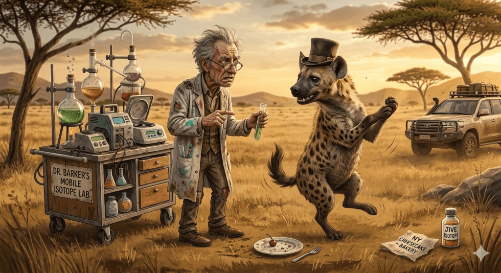 He decided to go mobile by testing it in the wild but a hyena appeared and drank his sample.