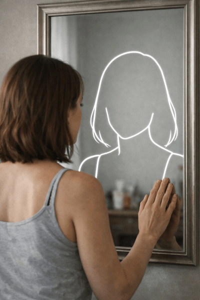 a woman reaching for her own reflection