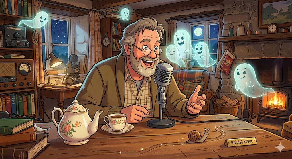 Deep inside a quaint cottage, Chester’s zeal for the strange reached its peak. He sat before a classic old microphone, trusty teapot at his elbow, broadcasting to an enthusiastic audience of ghosts. A brave little snail raced across the table as Chester narrated the epic journey. It was, admittedly, slow going but the ratings were “out-of-this-world”, and the snail was destined to become immortal.