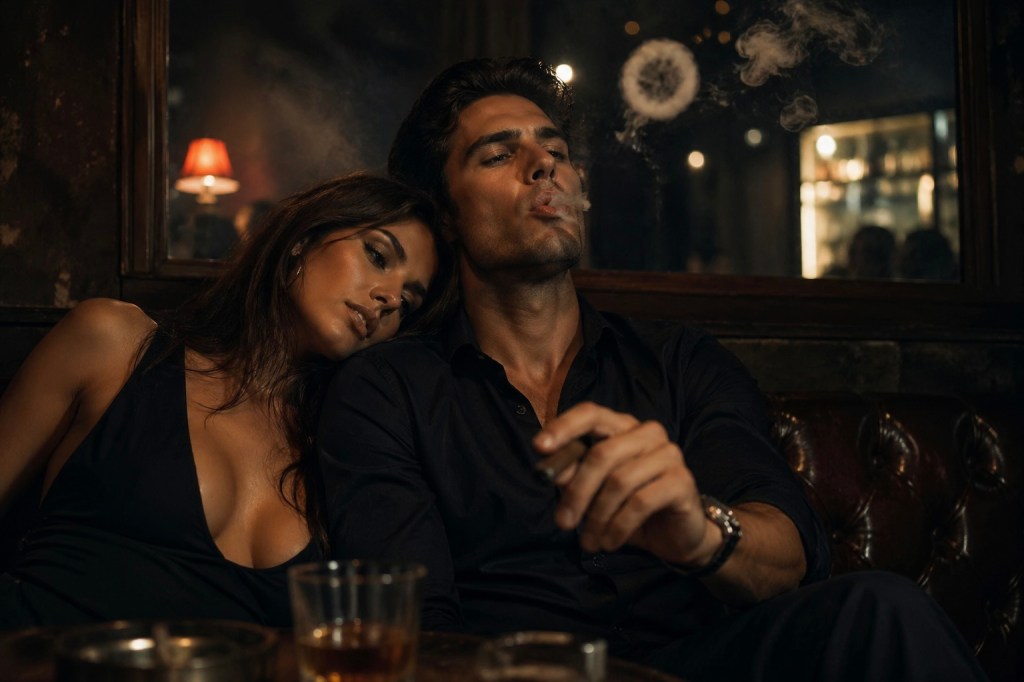 The smoke ring drifted toward the ceiling like a lazy wish dissolving into warm air. Rocco leaned back against the leather booth, one arm draped around Elena, who fit perfectly against his side as though she’d always belonged there.