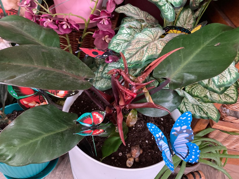 It’s fascinating to me how these two philodendrons unfurl and almost “shed” their casing to allow for new leaf growth. As far as I know neither of these plants will bear flowers but anything can happen with some sun, water and TLC.