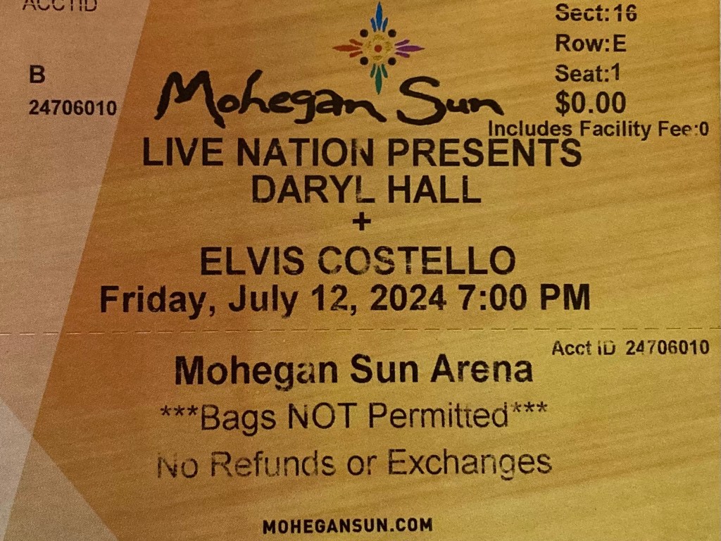 Our main reason for going to Mohegan Sun was to see the Daryl Hall + Elvis Costello Concert Tour. We took advantage of the accommodations/concert package which meant we didn’t know in advance where we’d be sitting for the show or how much the tickets cost. You can see by the photo of my ticket that there’s no price indicated. It turns out the seats were very good and we had a clear view of the stage.